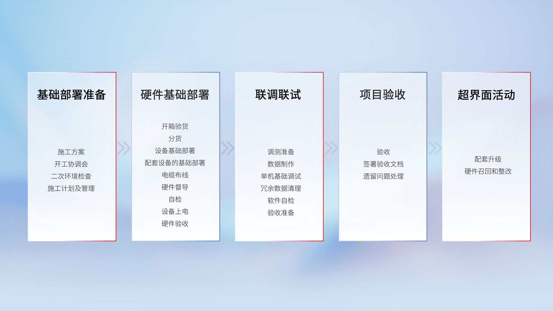 从基础部署准备、、、、硬件基础部署、、、联调联试、、、、项目验收、、、越界面活动的全过程可追溯,,,,保证施工质量和进度。。